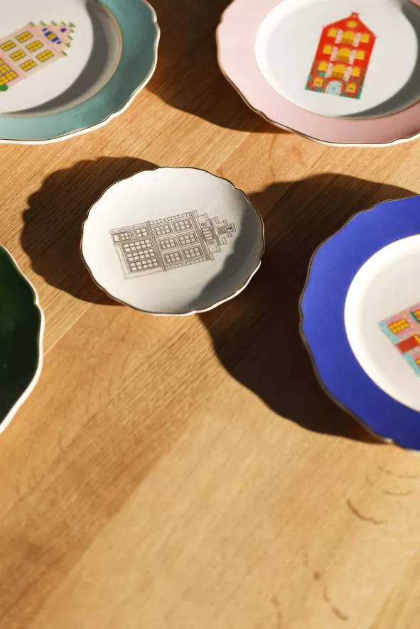 De Canal House gebaksbordje Ø13 set van 4 van &klevering bestaat uit een set van 4 borden. Elk bord heeft een diameter van 13 centimeter en een hoogte van 1,5 centimeter. De borden wegen 0,44 kilo per stuk en zijn gemaakt van porselein. De borden zijn niet geschikt om in de magnetron te doen en &klevering raadt aan om de borden niet in de vaatwasser te doen, maar met de hand af te wassen. De illustraties op de borden zijn gemaakt door Zoe Corbey.