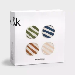 De Oblique ontbijtbord Ø18 set van 4 van &Klevering bestaat uit gestreepte borden met elk een andere kleur. Elk bord heeft een diameter van 18 centimeter en een hoogte van 1,5 centimeter. De borden zijn gemaakt van dolomiet en zijn vaatwasser bestendig.